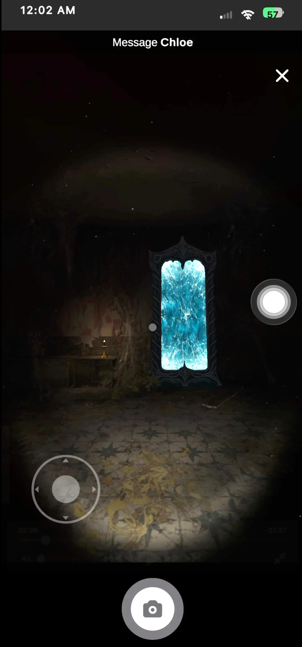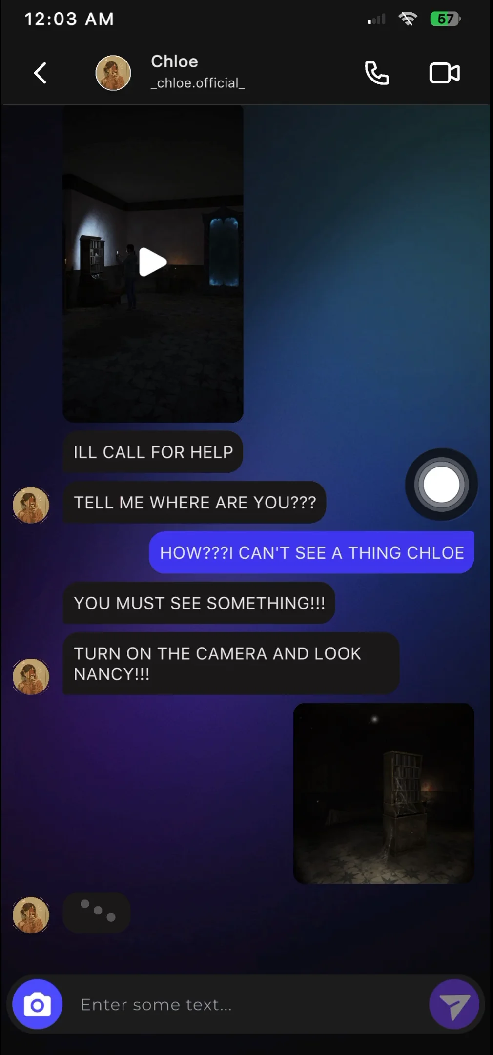 LLM) via a simulated messaging app. The player uses an in-game camera to send visual clues, and the LLM helps solve